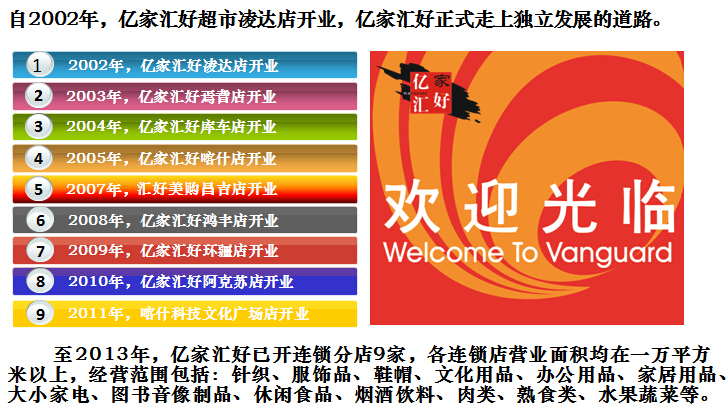 億家匯好商貿(mào)有限責(zé)任公司于2002年成立,并從臺(tái)灣引進(jìn)連鎖經(jīng)營職業(yè)管理團(tuán)隊(duì),統(tǒng)一管理旗下各地的連鎖超市。公司通過多年的穩(wěn)健發(fā)展,至2013年底,億家匯好商貿(mào)有限責(zé)任公司已成為擁有員工近3000多人,下轄一個(gè)配送中心和9家連鎖超市的大型綜合性零售企業(yè)。總經(jīng)營面積11萬多平方米,配送中心輻射公司所有超市,年配送額可達(dá)2億元。公司大量吸納下崗職工,經(jīng)過崗前培訓(xùn),提高勞動(dòng)技能,實(shí)現(xiàn)了他們的再就業(yè),為維護(hù)社會(huì)和諧穩(wěn)定做出了貢獻(xiàn)。2013年,巴州億家匯好商貿(mào)有限責(zé)任公司在自治區(qū)零售業(yè)中穩(wěn)踞前三位,是自治區(qū)重要的流通龍頭企業(yè),2013年年銷售收入達(dá)10億人民幣。多年來,公司一直重管理、抓實(shí)效、運(yùn)用先進(jìn)的管理手段和營銷理念,秉承億家匯好人 時(shí)時(shí)尋求效率創(chuàng)新,事事講究專業(yè)技術(shù)的文化精髓,創(chuàng)造了良好的經(jīng)濟(jì)效益和社會(huì)效益。公司先后多次被消費(fèi)者協(xié)會(huì)評(píng)為誠信單位,并多年被評(píng)為重合同,守信用單位。